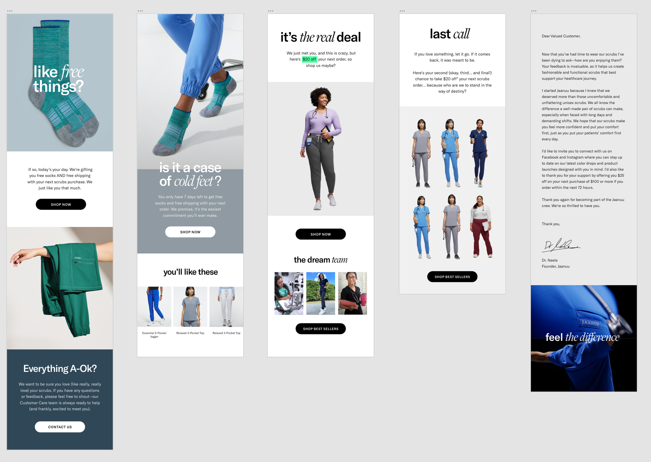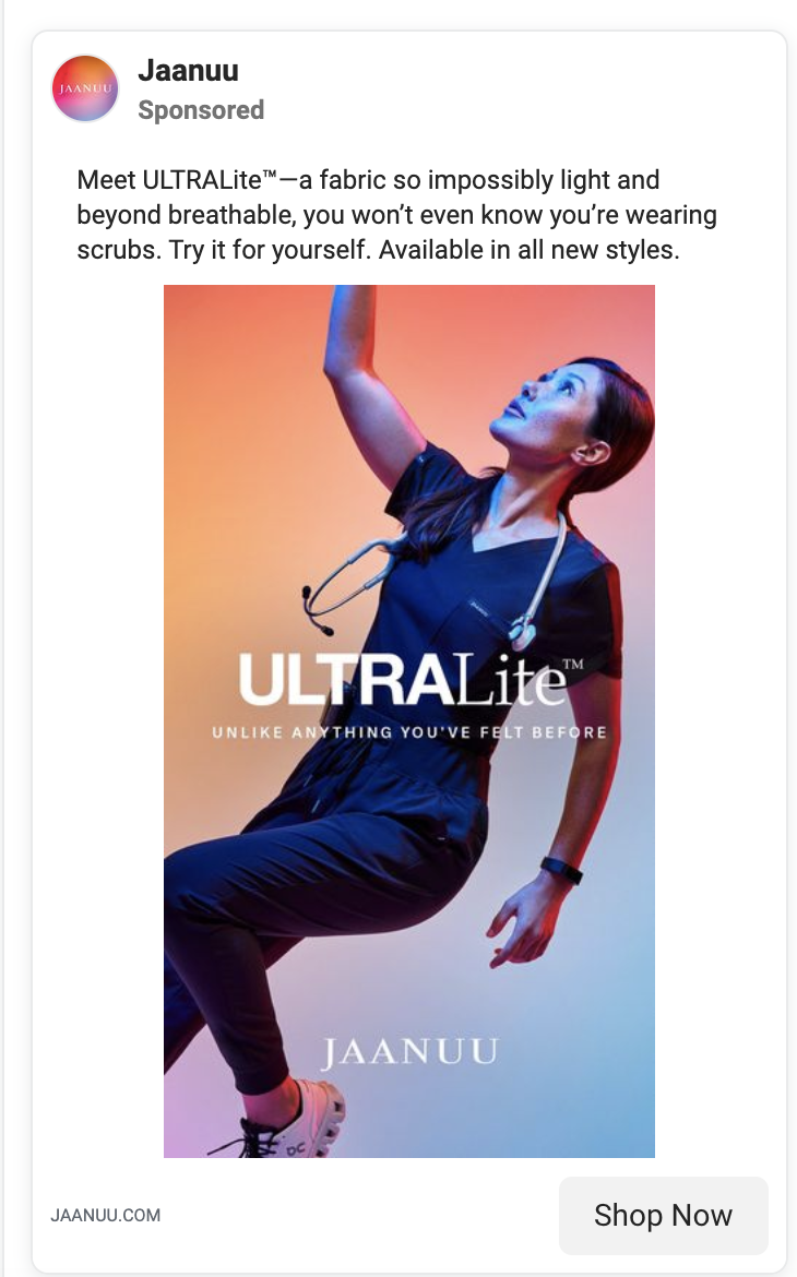 For Jaanuu, it was all about showing healthcare pros that we truly understood them. Copy highlighted the real benefits of the products—like snack pockets for long shifts and breathable fabrics that keep you dry for those 12+ hours shifts even when your deodorant can’t. This approach resulted in,